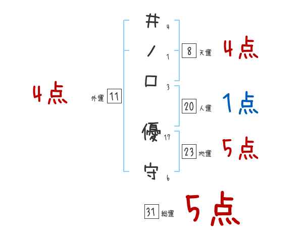 天運![]() | 井ノ口優守さんの天運は8画の4つ星!勤勉家。根気強く努力し成功する。忍耐力がある。 家系が持つ宿命的な運勢を表します。祖先から受け継いだ苗字ですので自分の力が及びません。家柄を象徴します。 |