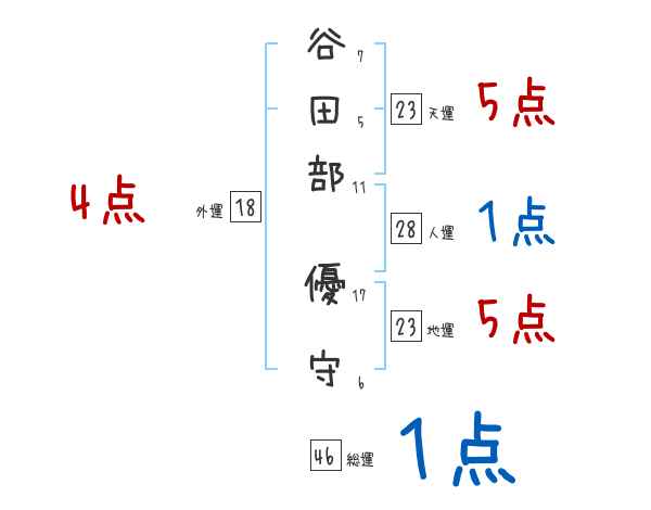 総運![]() | 谷田部優守さんの総運は46画の1つ星!迷走することが多く苦労するかも。目先のことにとらわれないように。 あなたの人生を表す1番重要な運勢です。生涯を通じて影響する総合運となり、主に50歳以降の晩年期に影響を及ぼします。 |