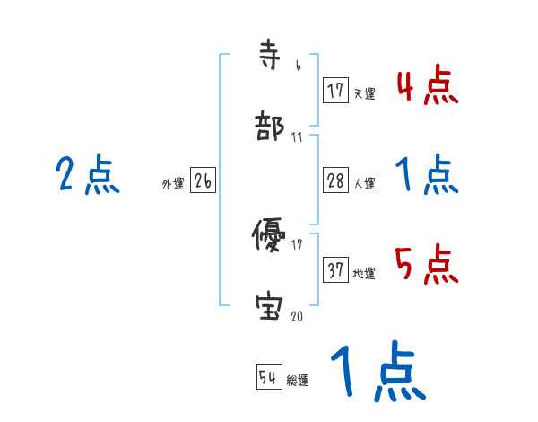 外運![]() | 寺部優宝さんの外運は26画の2つ星!波瀾万丈かも。信頼できる人を大事にしましょう。 生活面を象徴する運勢です。外部から受ける影響力を表し、結婚運、家庭運や職場、環境への順応性を表します。 |
