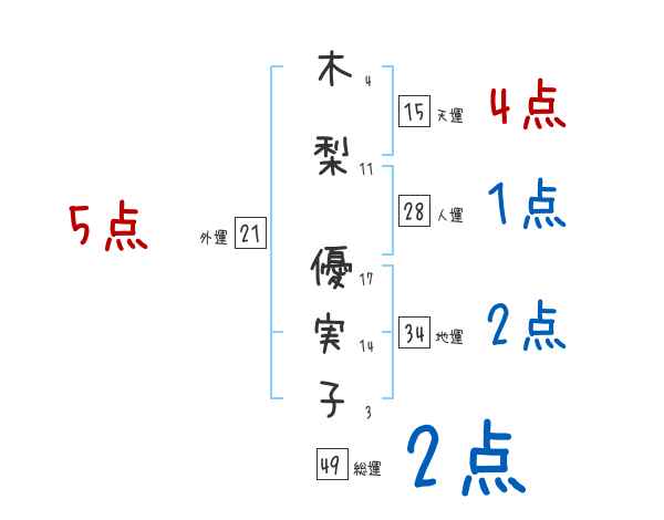 外運![]() | 木梨優実子さんの外運は21画の5つ星!統率力がある。独立し成功する。名誉を手に入れる。 生活面を象徴する運勢です。外部から受ける影響力を表し、結婚運、家庭運や職場、環境への順応性を表します。 |
