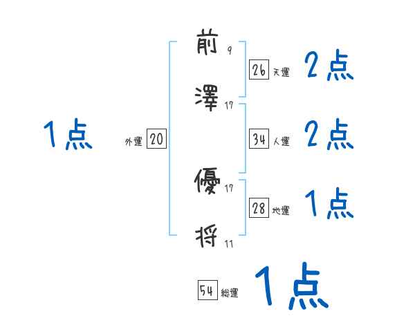 天運![]() | 前澤優将さんの天運は26画の2つ星!波瀾万丈かも。信頼できる人を大事にしましょう。 家系が持つ宿命的な運勢を表します。祖先から受け継いだ苗字ですので自分の力が及びません。家柄を象徴します。 |