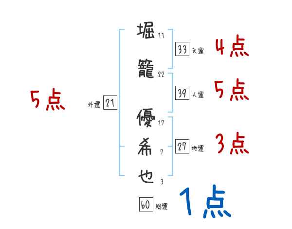 外運![]() | 堀籠優希也さんの外運は21画の5つ星!統率力がある。独立し成功する。名誉を手に入れる。 生活面を象徴する運勢です。外部から受ける影響力を表し、結婚運、家庭運や職場、環境への順応性を表します。 |