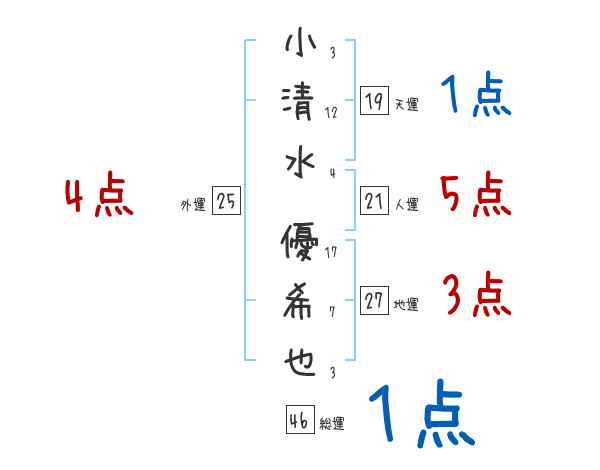 天運![]() | 小清水優希也さんの天運は19画の1つ星!優れた才能を持ちますが、協調性が足りないことも。周りの人と協力する事を意識しましょう。 家系が持つ宿命的な運勢を表します。祖先から受け継いだ苗字ですので自分の力が及びません。家柄を象徴します。 |