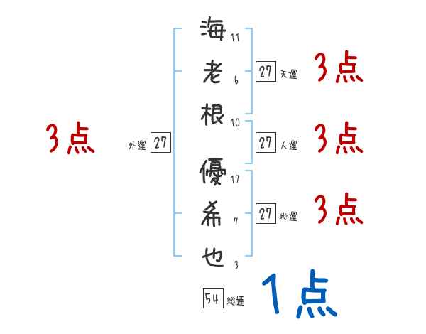 総運![]() | 海老根優希也さんの総運は54画の1つ星!トラブルが多いかも。周りをよく見て協調して過ごしましょう。 あなたの人生を表す1番重要な運勢です。生涯を通じて影響する総合運となり、主に50歳以降の晩年期に影響を及ぼします。 |