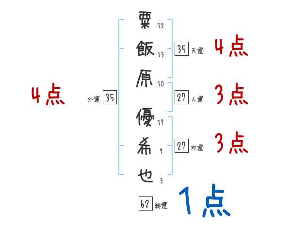 人運![]() | 粟飯原優希也さんの人運は27画の3つ星!頭脳明晰だが強情で摩擦が多い傾向。孤立に注意。 性格や才能などを表す2番目に重要な運勢です。人間関係や協調性、社会的な成功に影響します。主に20歳から50歳ぐらいまでの中年期の運勢を表します。 |
