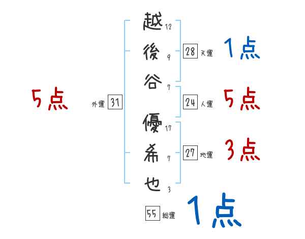 天運![]() | 越後谷優希也さんの天運は28画の1つ星!家庭環境に注意。スポーツで活躍できる能力があるかも。 家系が持つ宿命的な運勢を表します。祖先から受け継いだ苗字ですので自分の力が及びません。家柄を象徴します。 |