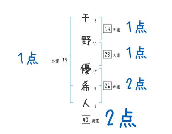 人運![]() | 千野優希人さんの人運は28画の1つ星!家庭環境に注意。スポーツで活躍できる能力があるかも。 性格や才能などを表す2番目に重要な運勢です。人間関係や協調性、社会的な成功に影響します。主に20歳から50歳ぐらいまでの中年期の運勢を表します。 |