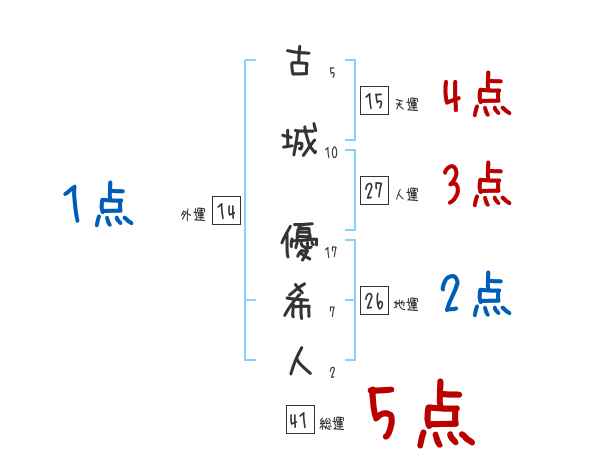 外運![]() | 古城優希人さんの外運は14画の1つ星!人に対して優しいがストレスを溜め込みがち。人間関係のトラブルを避けるよう気をつけましょう。 生活面を象徴する運勢です。外部から受ける影響力を表し、結婚運、家庭運や職場、環境への順応性を表します。 |