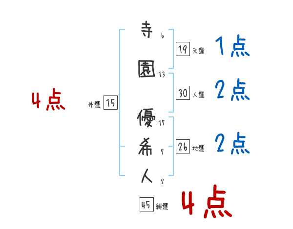 外運![]() | 寺園優希人さんの外運は15画の4つ星!人徳があり出世する。順調に物事を進め円満な人生。 生活面を象徴する運勢です。外部から受ける影響力を表し、結婚運、家庭運や職場、環境への順応性を表します。 |