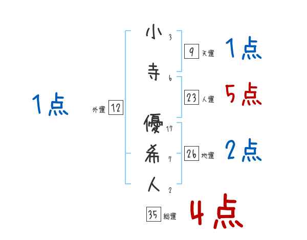 人運![]() | 小寺優希人さんの人運は23画の5つ星!想像力に優れ活力がある。一代で成功し名誉を手に入れる。 性格や才能などを表す2番目に重要な運勢です。人間関係や協調性、社会的な成功に影響します。主に20歳から50歳ぐらいまでの中年期の運勢を表します。 |