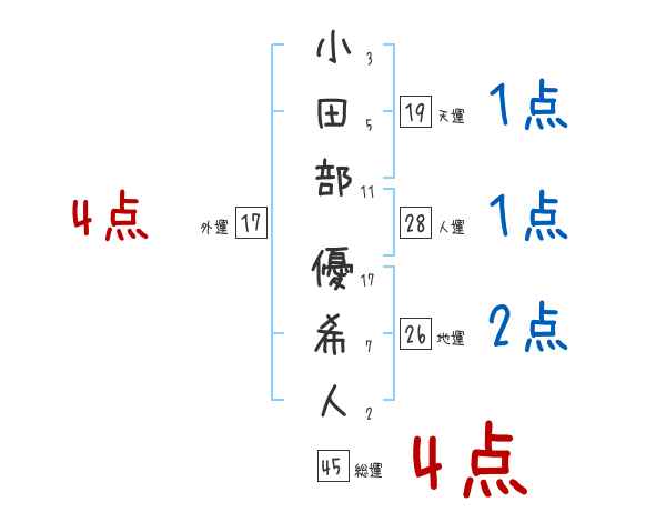 外運![]() | 小田部優希人さんの外運は17画の4つ星!積極的な行動力。地位を気づき財産を手に入れる。純粋な心と直感力。 生活面を象徴する運勢です。外部から受ける影響力を表し、結婚運、家庭運や職場、環境への順応性を表します。 |