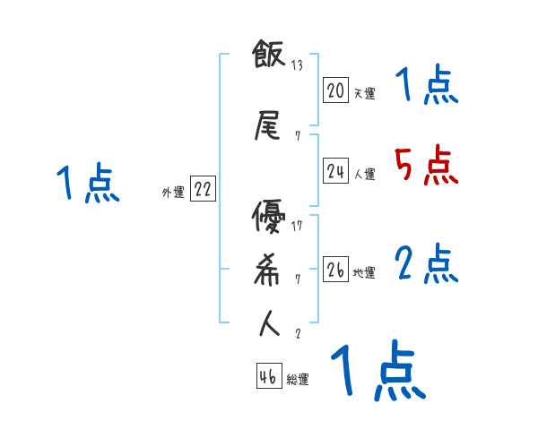 外運![]() | 飯尾優希人さんの外運は22画の1つ星!努力することが苦手ないっぽう手先が器用。芸術性にも優れる。 生活面を象徴する運勢です。外部から受ける影響力を表し、結婚運、家庭運や職場、環境への順応性を表します。 |