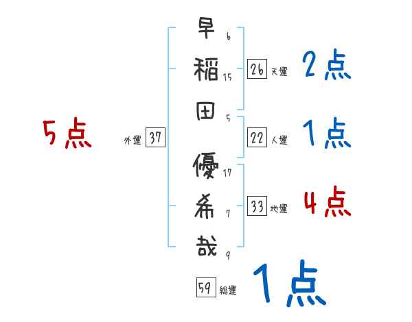 外運![]() | 早稲田優希哉さんの外運は37画の5つ星!努力家で順応性に優れる。現実的な考え方ができ忠実に物事をこなす。 生活面を象徴する運勢です。外部から受ける影響力を表し、結婚運、家庭運や職場、環境への順応性を表します。 |
