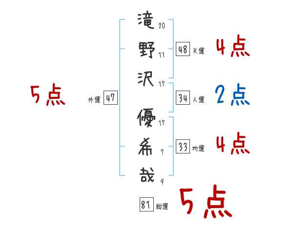 総運![]() | 滝野沢優希哉さんの総運は81画の5つ星!行動力、指導力があり出世し繁栄する。幸運に恵まれる。 あなたの人生を表す1番重要な運勢です。生涯を通じて影響する総合運となり、主に50歳以降の晩年期に影響を及ぼします。 |