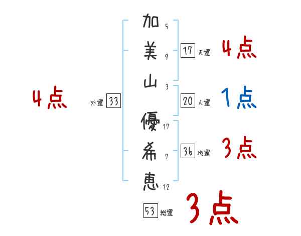 総運![]() | 加美山優希恵さんの総運は53画の3つ星!やや見栄っ張りで虚栄心がある。散財に注意。 あなたの人生を表す1番重要な運勢です。生涯を通じて影響する総合運となり、主に50歳以降の晩年期に影響を及ぼします。 |