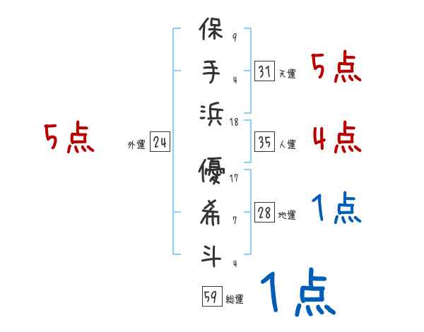 人運![]() | 保手浜優希斗さんの人運は35画の4つ星!温厚な性格で感受性が高い。穏和な性格で人望が厚い。 性格や才能などを表す2番目に重要な運勢です。人間関係や協調性、社会的な成功に影響します。主に20歳から50歳ぐらいまでの中年期の運勢を表します。 |