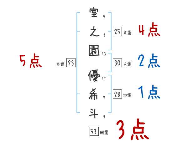 総運![]() | 室之園優希斗さんの総運は53画の3つ星!やや見栄っ張りで虚栄心がある。散財に注意。 あなたの人生を表す1番重要な運勢です。生涯を通じて影響する総合運となり、主に50歳以降の晩年期に影響を及ぼします。 |