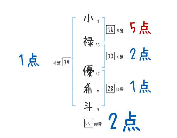 天運![]() | 小禄優希斗さんの天運は16画の5つ星!人望が厚く大きく発展する。逆転成功が見える。 家系が持つ宿命的な運勢を表します。祖先から受け継いだ苗字ですので自分の力が及びません。家柄を象徴します。 |