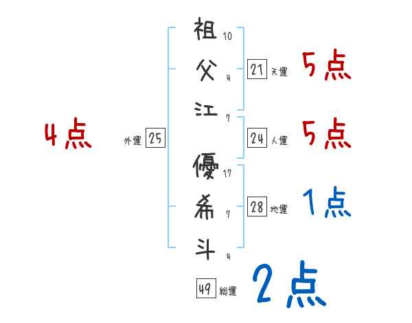 | 天運  | 祖父江優希斗さんの天運は21画の5つ星!統率力がある。独立し成功する。名誉を手に入れる。家系が持つ宿命的な運勢を表します。祖先から受け継いだ苗字ですので自分の力が及びません。家柄を象徴します。 |