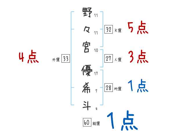 天運![]() | 野々宮優希斗さんの天運は32画の5つ星!柔軟性があり成功する。チャンスが多く金運が良い。 家系が持つ宿命的な運勢を表します。祖先から受け継いだ苗字ですので自分の力が及びません。家柄を象徴します。 |