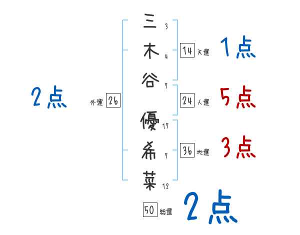 外運![]() | 三木谷優希菜さんの外運は26画の2つ星!波瀾万丈かも。信頼できる人を大事にしましょう。 生活面を象徴する運勢です。外部から受ける影響力を表し、結婚運、家庭運や職場、環境への順応性を表します。 |