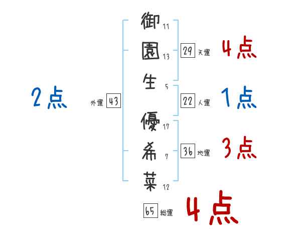 総運![]() | 御園生優希菜さんの総運は65画の4つ星!幸運に恵まれ繁栄する。包容力がある。 あなたの人生を表す1番重要な運勢です。生涯を通じて影響する総合運となり、主に50歳以降の晩年期に影響を及ぼします。 |