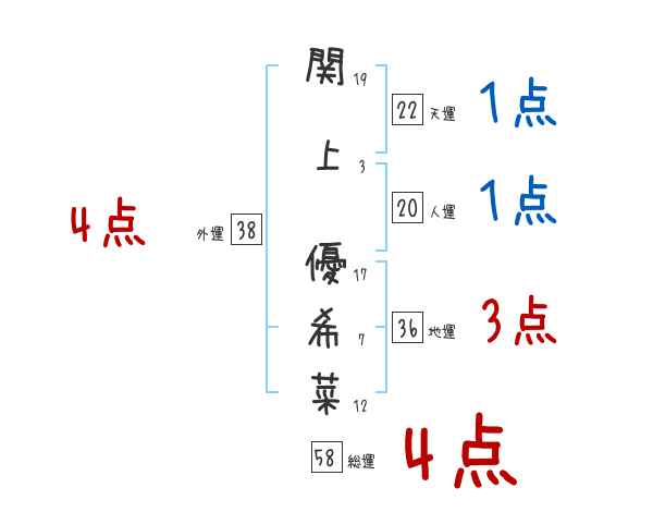 総運![]() | 関上優希菜さんの総運は58画の4つ星!安定した生活。大器晩成タイプ。 あなたの人生を表す1番重要な運勢です。生涯を通じて影響する総合運となり、主に50歳以降の晩年期に影響を及ぼします。 |