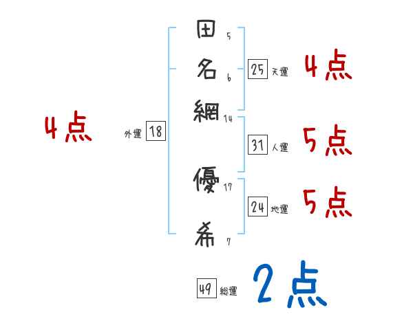 総運![]() | 田名網優希さんの総運は49画の2つ星!不安定な性格で明暗がある人生。周りの人には支援されやすい。 あなたの人生を表す1番重要な運勢です。生涯を通じて影響する総合運となり、主に50歳以降の晩年期に影響を及ぼします。 |