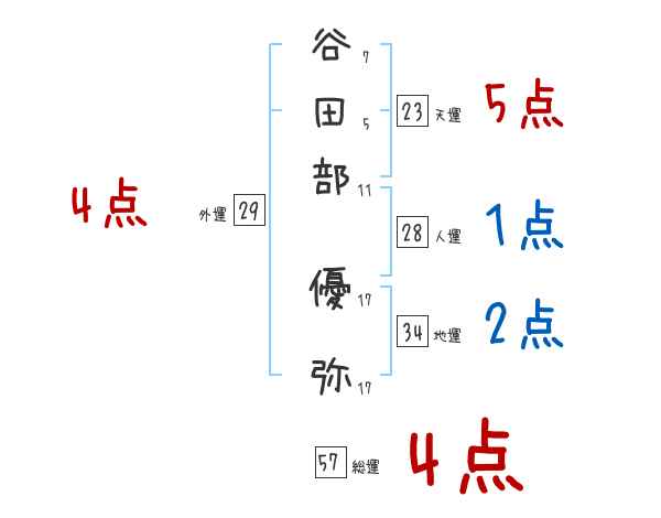 総運![]() | 谷田部優弥さんの総運は57画の4つ星!向上心があり人望がある。地位を得る。 あなたの人生を表す1番重要な運勢です。生涯を通じて影響する総合運となり、主に50歳以降の晩年期に影響を及ぼします。 |