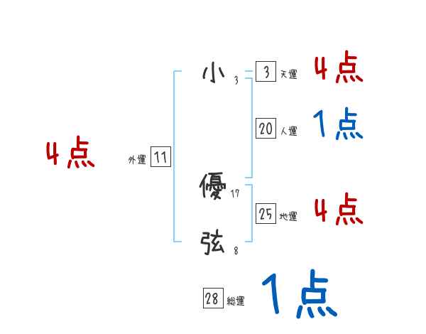 天運![]() | 小優弦さんの天運は3画の4つ星!活動的で才能に恵まれ、多くの信頼を得る。希望に満ち成長する。 家系が持つ宿命的な運勢を表します。祖先から受け継いだ苗字ですので自分の力が及びません。家柄を象徴します。 |