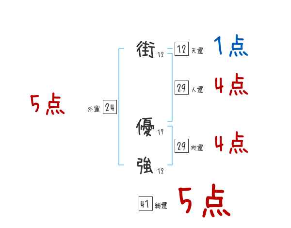 人運![]() | 街優強さんの人運は29画の4つ星!完全主義で才能がある。厳格な心の持ち主。 性格や才能などを表す2番目に重要な運勢です。人間関係や協調性、社会的な成功に影響します。主に20歳から50歳ぐらいまでの中年期の運勢を表します。 |