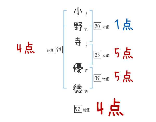 総運![]() | 小野寺優徳さんの総運は52画の4つ星!先見性と独創性に優れ考える力がある。強運の持ち主。 あなたの人生を表す1番重要な運勢です。生涯を通じて影響する総合運となり、主に50歳以降の晩年期に影響を及ぼします。 |