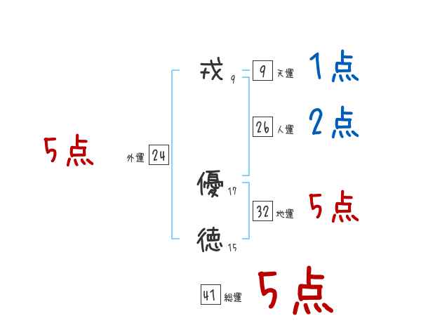 外運![]() | 戎優徳さんの外運は24画の5つ星!家庭運が良く順調な人生。金運にも恵まれる。 生活面を象徴する運勢です。外部から受ける影響力を表し、結婚運、家庭運や職場、環境への順応性を表します。 |
