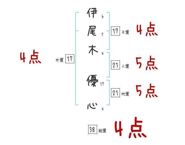 外運![]() | 伊尾木優心さんの外運は17画の4つ星!積極的な行動力。地位を気づき財産を手に入れる。純粋な心と直感力。 生活面を象徴する運勢です。外部から受ける影響力を表し、結婚運、家庭運や職場、環境への順応性を表します。 |