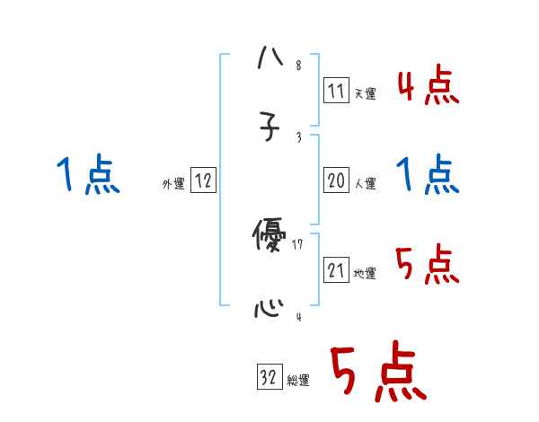 総運![]() | 八子優心さんの総運は32画の5つ星!柔軟性があり成功する。チャンスが多く金運が良い。 あなたの人生を表す1番重要な運勢です。生涯を通じて影響する総合運となり、主に50歳以降の晩年期に影響を及ぼします。 |