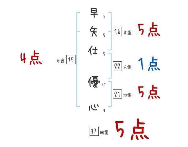 外運![]() | 早矢仕優心さんの外運は15画の4つ星!人徳があり出世する。順調に物事を進め円満な人生。 生活面を象徴する運勢です。外部から受ける影響力を表し、結婚運、家庭運や職場、環境への順応性を表します。 |