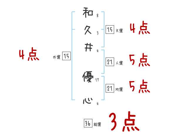 人運![]() | 和久井優心さんの人運は21画の5つ星!統率力がある。独立し成功する。名誉を手に入れる。 性格や才能などを表す2番目に重要な運勢です。人間関係や協調性、社会的な成功に影響します。主に20歳から50歳ぐらいまでの中年期の運勢を表します。 |
