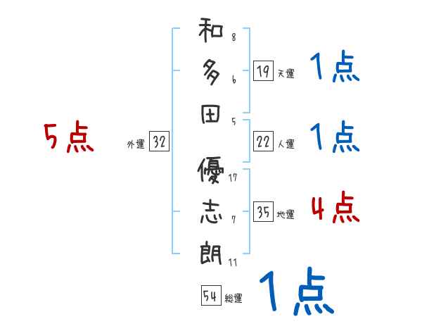 外運![]() | 和多田優志朗さんの外運は32画の5つ星!柔軟性があり成功する。チャンスが多く金運が良い。 生活面を象徴する運勢です。外部から受ける影響力を表し、結婚運、家庭運や職場、環境への順応性を表します。 |