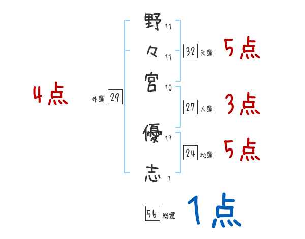天運![]() | 野々宮優志さんの天運は32画の5つ星!柔軟性があり成功する。チャンスが多く金運が良い。 家系が持つ宿命的な運勢を表します。祖先から受け継いだ苗字ですので自分の力が及びません。家柄を象徴します。 |