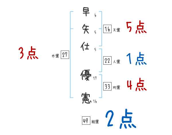 天運![]() | 早矢仕優憲さんの天運は16画の5つ星!人望が厚く大きく発展する。逆転成功が見える。 家系が持つ宿命的な運勢を表します。祖先から受け継いだ苗字ですので自分の力が及びません。家柄を象徴します。 |