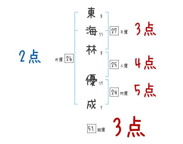 外運![]() | 東海林優成さんの外運は26画の2つ星!波瀾万丈かも。信頼できる人を大事にしましょう。 生活面を象徴する運勢です。外部から受ける影響力を表し、結婚運、家庭運や職場、環境への順応性を表します。 |