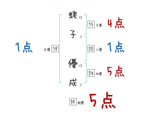 総運![]() | 蛯子優成さんの総運は39画の5つ星!社交性に優れ人望が厚い。人の上に立ち成功する。 あなたの人生を表す1番重要な運勢です。生涯を通じて影響する総合運となり、主に50歳以降の晩年期に影響を及ぼします。 |