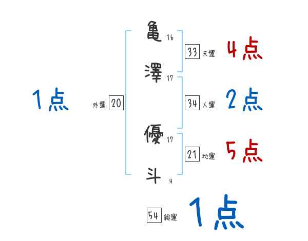 外運![]() | 亀澤優斗さんの外運は20画の1つ星!社交が苦手。人とは違った才能があり波乱万丈な人生かも。 生活面を象徴する運勢です。外部から受ける影響力を表し、結婚運、家庭運や職場、環境への順応性を表します。 |