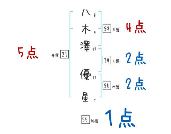 外運![]() | 八木澤優星さんの外運は21画の5つ星!統率力がある。独立し成功する。名誉を手に入れる。 生活面を象徴する運勢です。外部から受ける影響力を表し、結婚運、家庭運や職場、環境への順応性を表します。 |