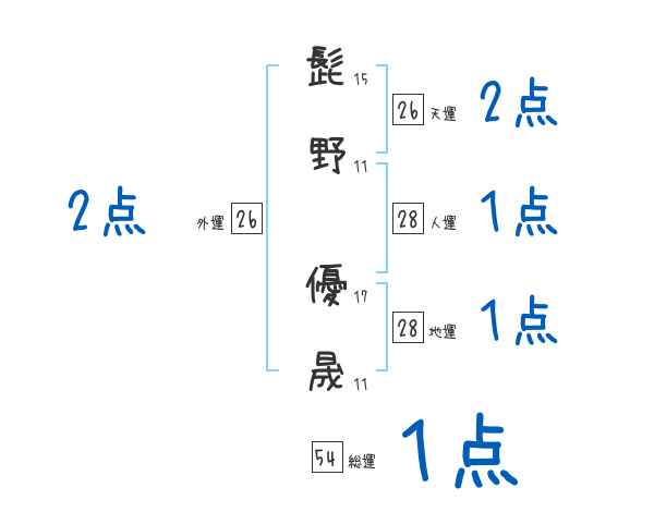 天運![]() | 髭野優晟さんの天運は26画の2つ星!波瀾万丈かも。信頼できる人を大事にしましょう。 家系が持つ宿命的な運勢を表します。祖先から受け継いだ苗字ですので自分の力が及びません。家柄を象徴します。 |