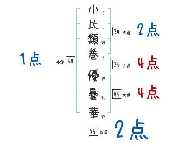 総運![]() | 小比類巻優曇華さんの総運は79画の2つ星!消極的な性格で不振に終わることが多い。不安定にならないように気をつけましょう。 あなたの人生を表す1番重要な運勢です。生涯を通じて影響する総合運となり、主に50歳以降の晩年期に影響を及ぼします。 |
