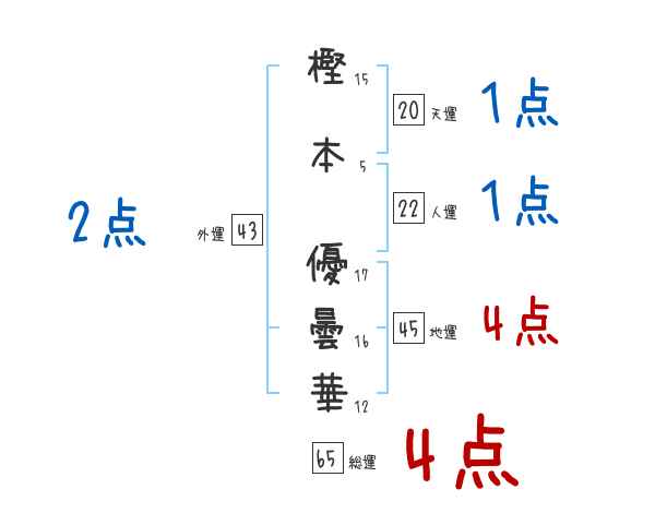 人運![]() | 樫本優曇華さんの人運は22画の1つ星!努力することが苦手ないっぽう手先が器用。芸術性にも優れる。 性格や才能などを表す2番目に重要な運勢です。人間関係や協調性、社会的な成功に影響します。主に20歳から50歳ぐらいまでの中年期の運勢を表します。 |