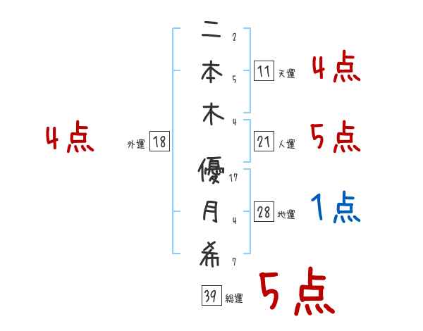 人運![]() | 二本木優月希さんの人運は21画の5つ星!統率力がある。独立し成功する。名誉を手に入れる。 性格や才能などを表す2番目に重要な運勢です。人間関係や協調性、社会的な成功に影響します。主に20歳から50歳ぐらいまでの中年期の運勢を表します。 |