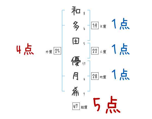 天運![]() | 和多田優月希さんの天運は19画の1つ星!優れた才能を持ちますが、協調性が足りないことも。周りの人と協力する事を意識しましょう。 家系が持つ宿命的な運勢を表します。祖先から受け継いだ苗字ですので自分の力が及びません。家柄を象徴します。 |