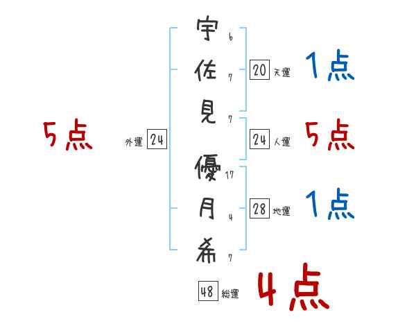 人運![]() | 宇佐見優月希さんの人運は24画の5つ星!家庭運が良く順調な人生。金運にも恵まれる。 性格や才能などを表す2番目に重要な運勢です。人間関係や協調性、社会的な成功に影響します。主に20歳から50歳ぐらいまでの中年期の運勢を表します。 |